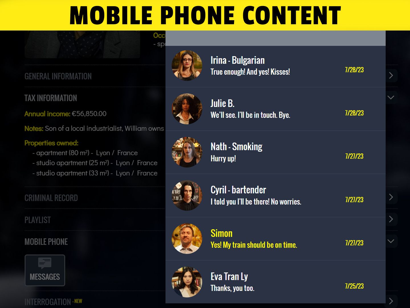 Video statements, interactive dialogues, photos of crime scenes and clues, police reports, autopsy reports, detailed suspect files, text messages, photos, interactive police interrogation videos…